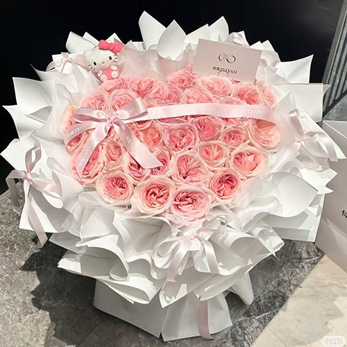 【温柔相伴】精选33朵粉荔枝玫瑰,心形造型,1只kitty猫(款式随机),表面粉色丝带蝴蝶结装饰。