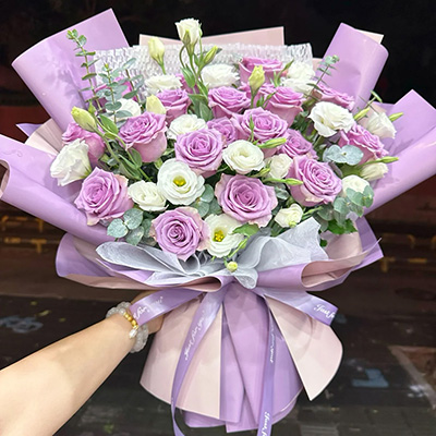 【紫色心情】精选19朵紫霞仙子紫玫瑰,6支多头浅色洋桔梗,搭配尤加利叶装饰。