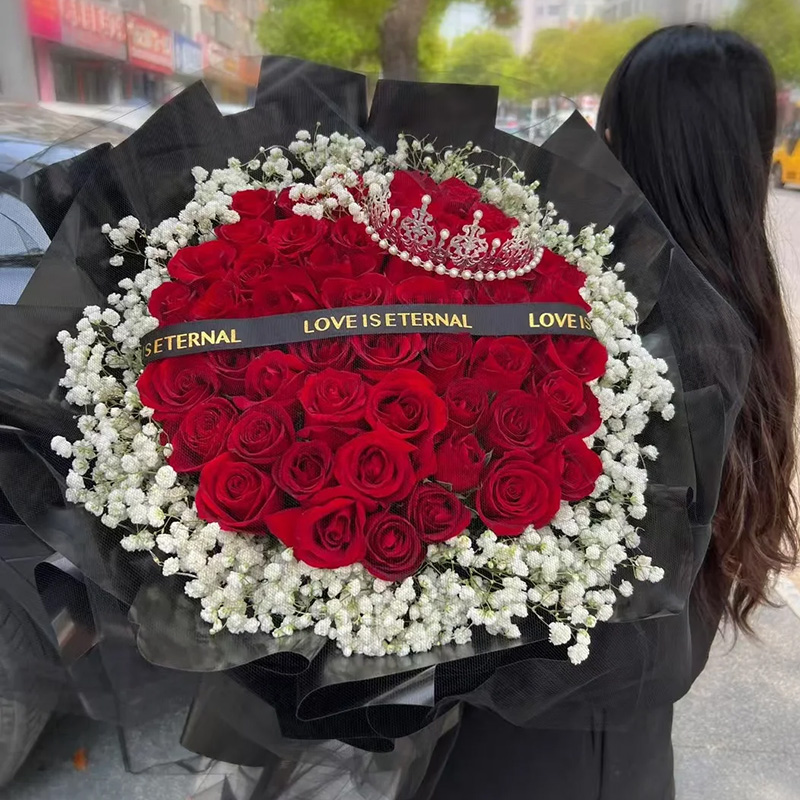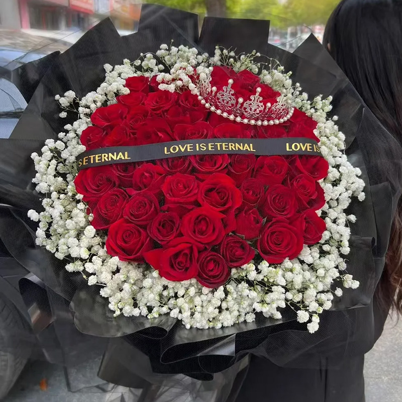 花 材:精选52朵顶级红玫瑰,1顶皇冠(款式随机),白色满天星环绕,黑色英文缎带装饰花面。