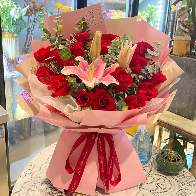 花材: 19枝卡罗拉红玫瑰,1枝多头粉百合,搭配尤加利叶装饰。