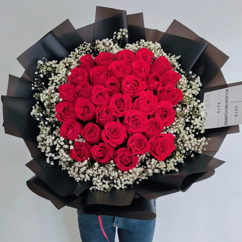 花材: 33朵红玫瑰,满天星环绕。