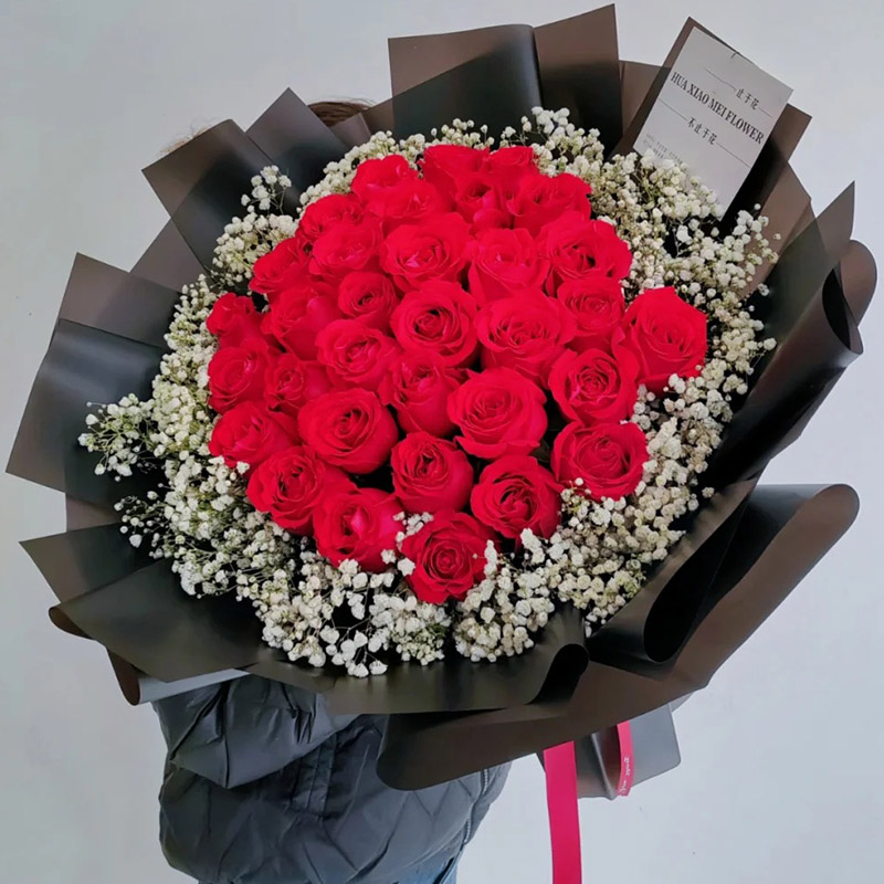 花 材:33朵红玫瑰,满天星环绕。