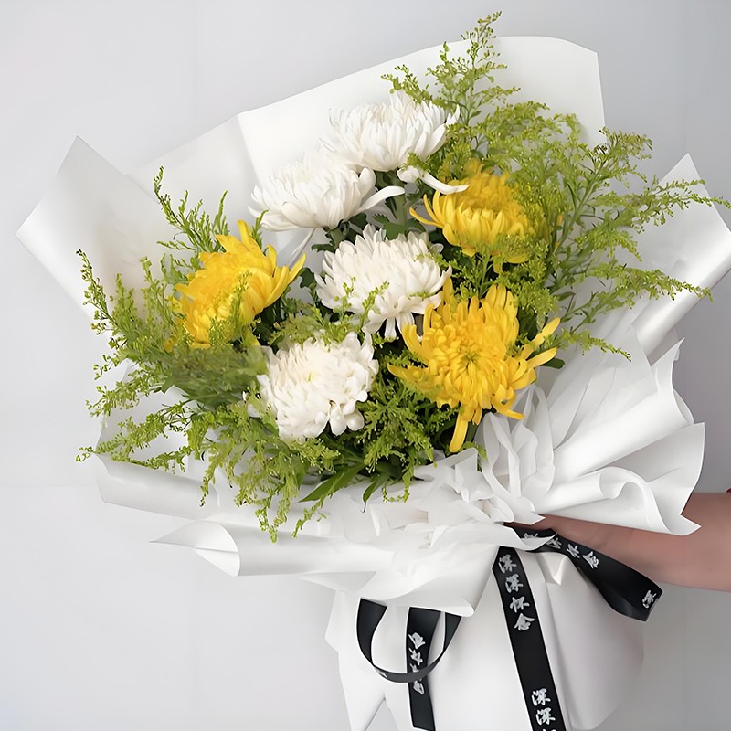 花材: 3朵黄色菊花,4朵白色菊花,搭配千层金(或尤加利叶)丰满间插
