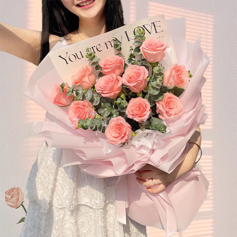 花 材:11枝精品戴安娜粉玫瑰,搭配尤加利叶间插丰满。