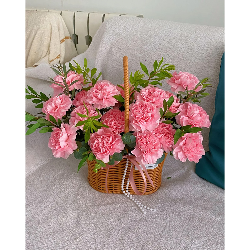 花材: 精选19朵粉色康乃馨,搭配九星叶、细叶尤加利叶装饰。