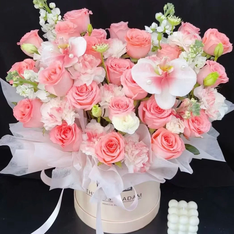 花材: 26枝戴安娜粉玫瑰,6枝粉色康乃馨,2朵白色蝴蝶兰(喷粉色),4枝白色紫罗兰,4支多头洋桔梗,尤加利叶装饰。