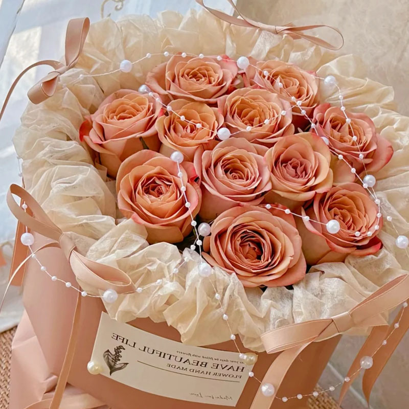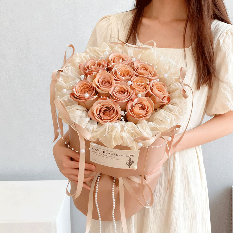 花材: 精选11枝卡布奇诺玫瑰,珠串装饰花面花体,5支同色系蝴蝶结围绕包装装饰,白色纸内衬,同色系小香风包装,珠串和同色系缎带花结。