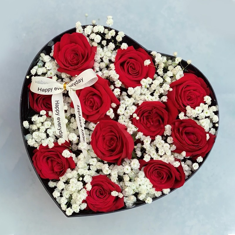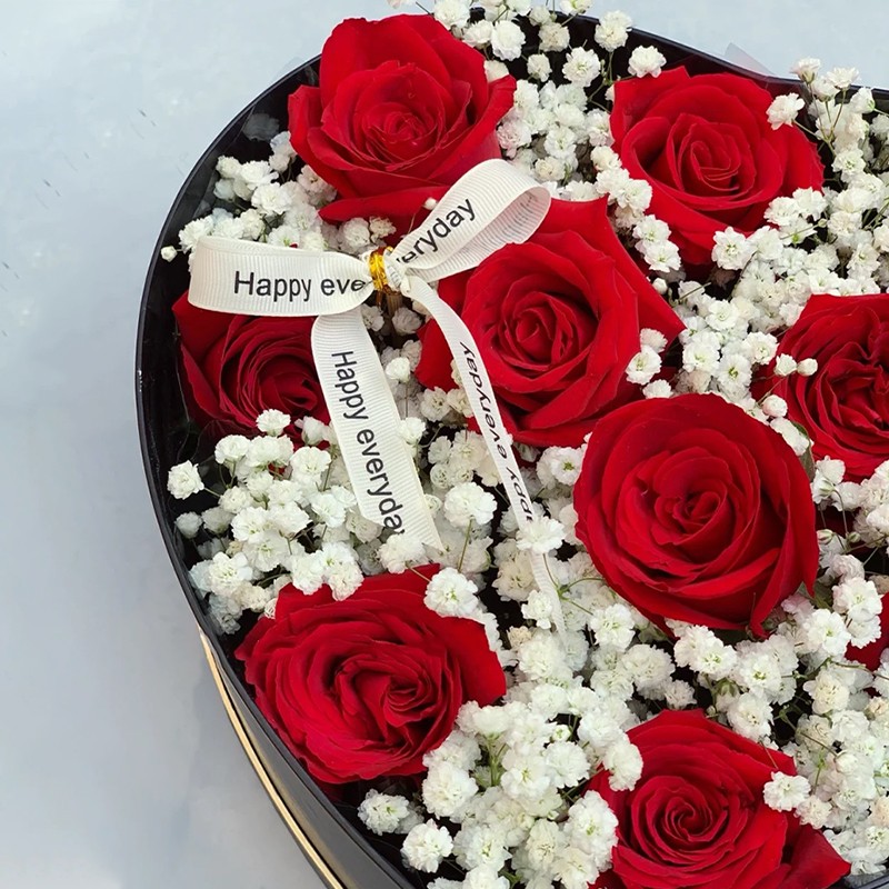 花 材:11朵红玫瑰,1个蝴蝶结装饰花面,满天星丰满间插。