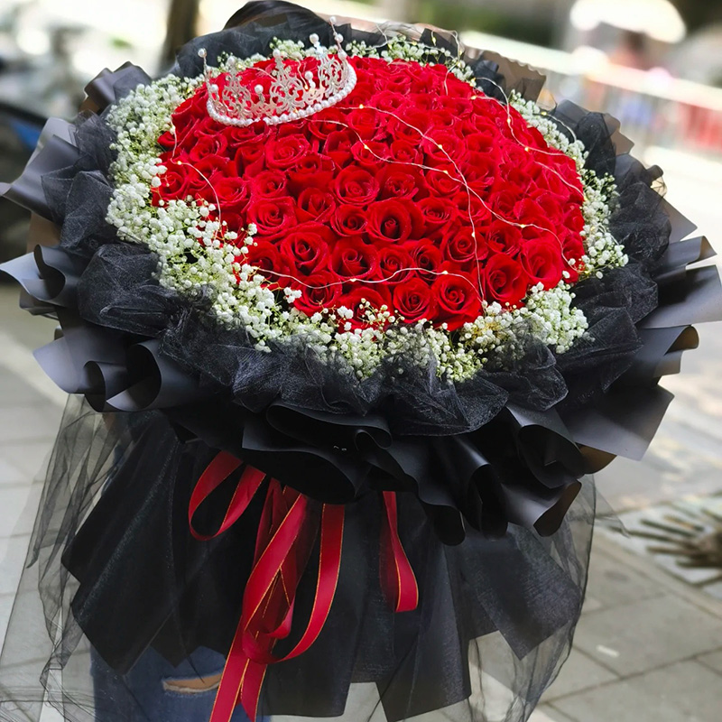 花 材:99支顶级红玫瑰,搭配皇冠、灯带装饰,满天星环绕。