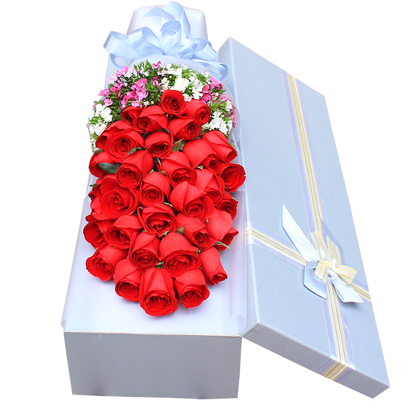 花 材:33枝红玫瑰,搭配石竹梅装饰。